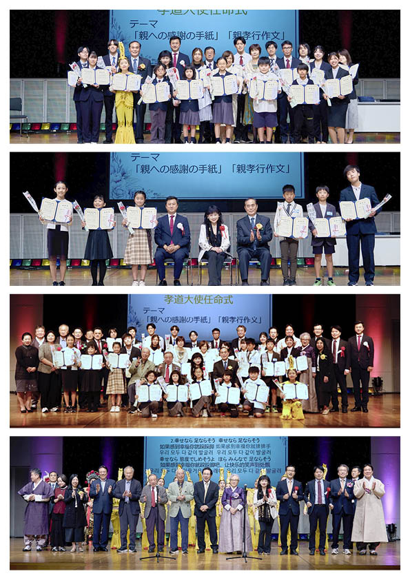 続いて、親孝行作文コンクールの表彰式および孝道大使任命式が行われ、受賞者の作文朗読や映像を通じて、孝道の実践がもたらす心の変化と成長が紹介されました。
