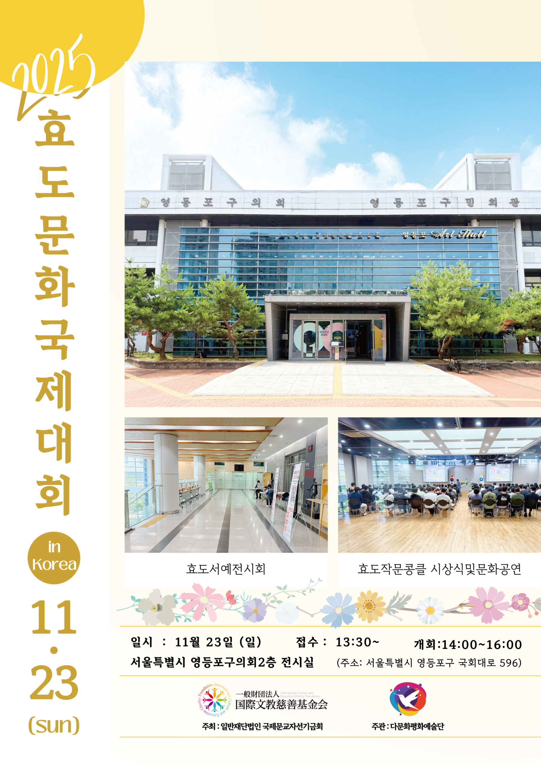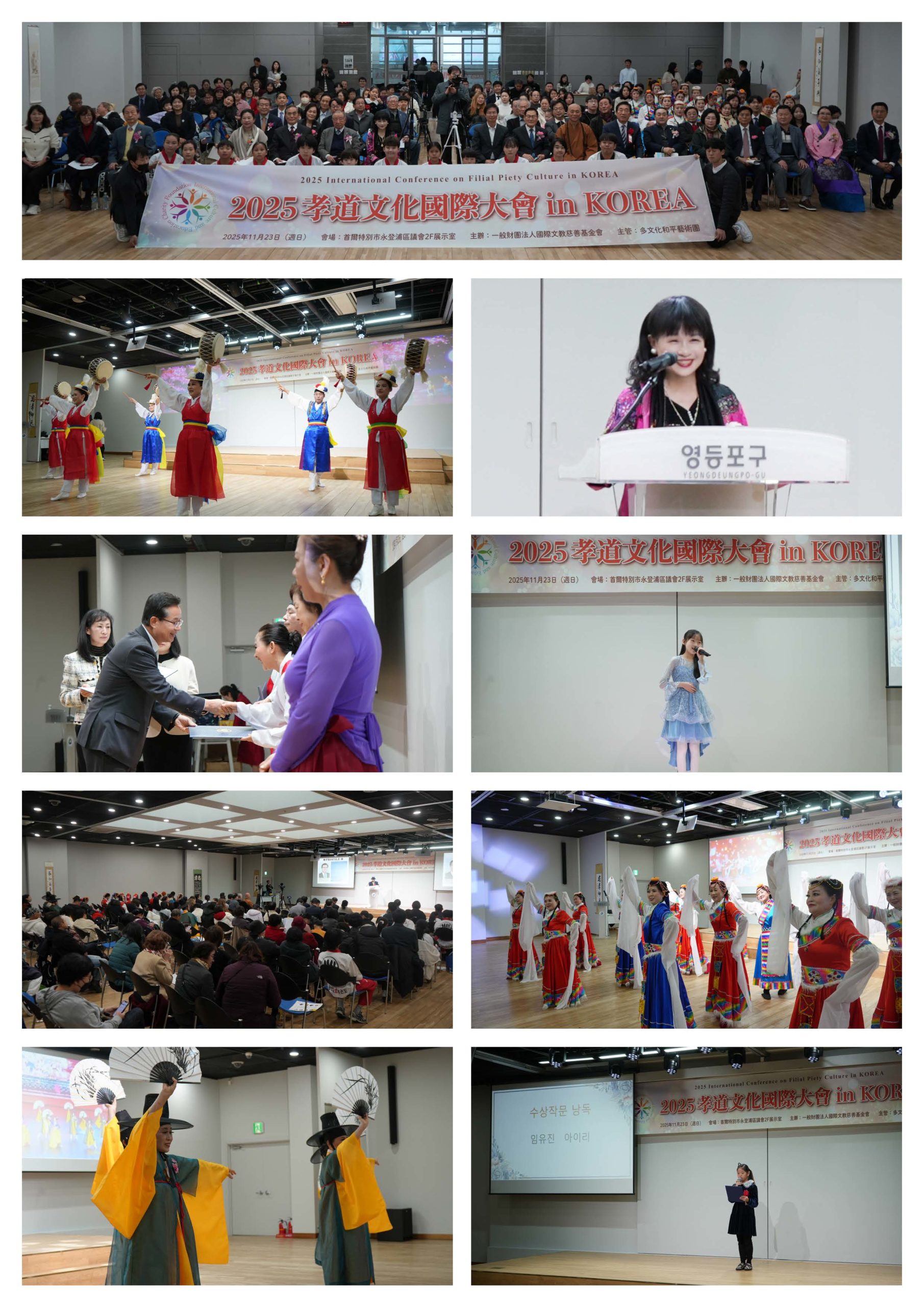 2025年11月23日、「2025 孝道文化国際大会 in KOREA」が、ソウル市永登浦区議会2階展示室にて盛大に開催されました。本大会は、当基金会と韓国の文化・教育関連団体の共催により実施され、書道展、文芸公演、孝道をテーマとした多彩なプログラムを通じて、国境を越えた文化交流を推進し、現代社会における「孝」の精神的価値を力強く発信しました。
