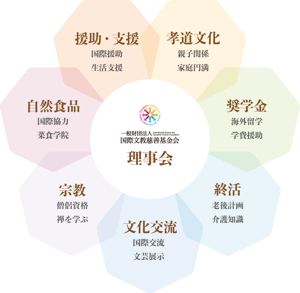 国際文化交流活動:絵画展、書道、茶道、華道、仏教文物展などの文化活動を開催